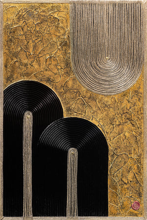 "24 Carati" explores the dualism between perfection and imperfection through the symbolic use of gold. The black arches, in contrast with the precious golden texture, represent the tension between light and darkness, eternity and transience, inviting reflection on the nature of value, both material and immaterial, in art and in life.