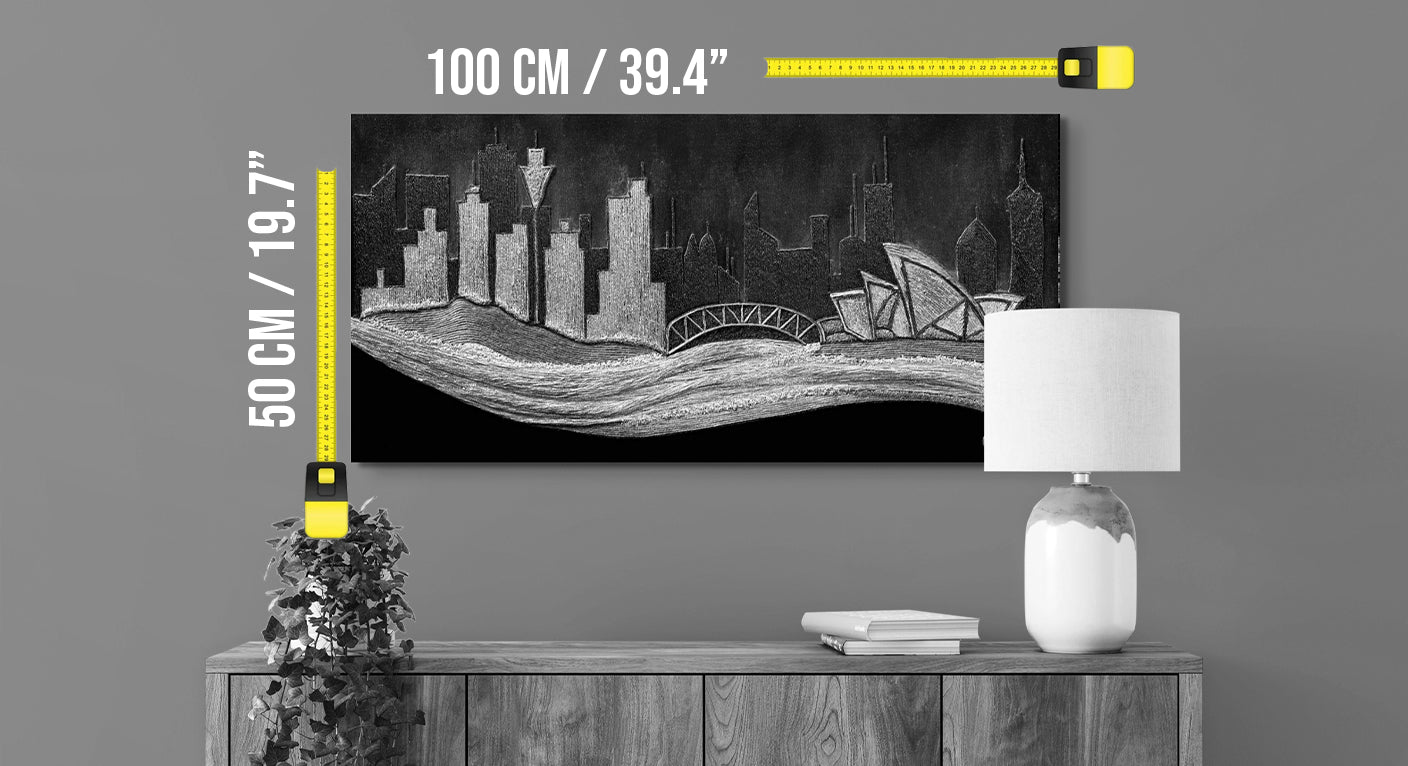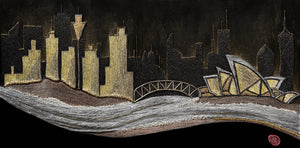 The use of precious materials such as gold, silver, and copper is not merely aesthetic but deeply symbolic: the city emerges from the canvas with the same strength with which it was built upon its sandstone foundations, a silent witness to eras interwoven between modernity and tradition. From the iconic Opera House to the Harbour Bridge, each architectural element engages in dialogue with the surrounding landscape, reflecting the profound connection between nature and urbanisation.